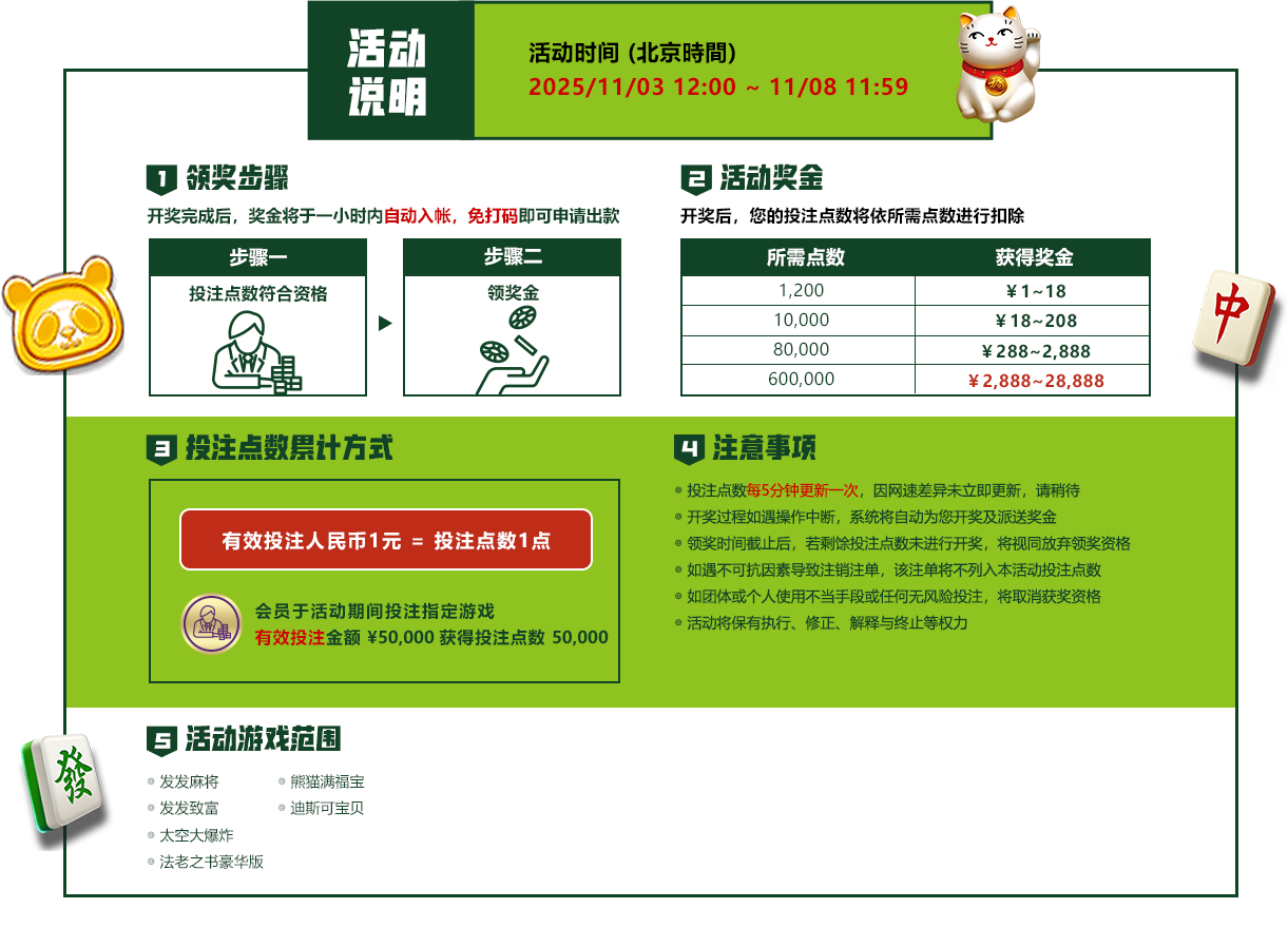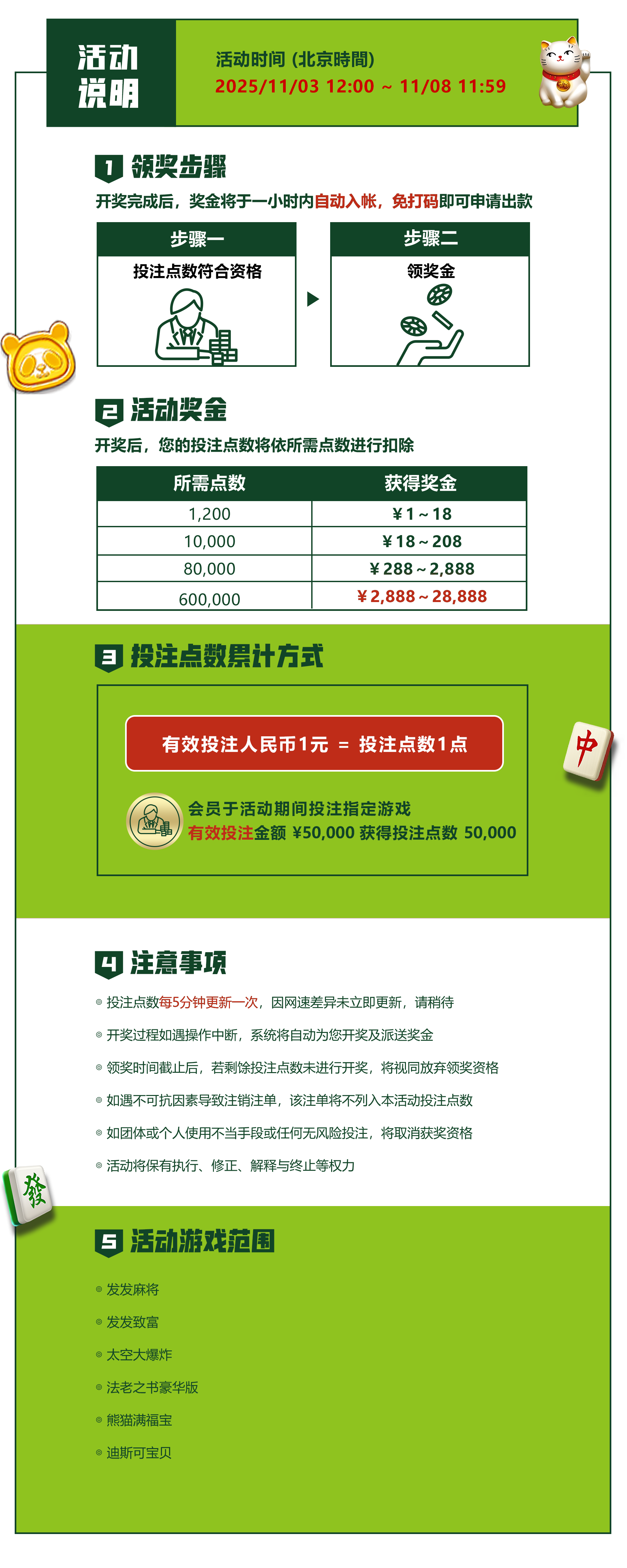 - 活动期间:2025/11/03 12:00 - 11/08 11:59 (北京时间),累积投注点数及领奖时间。