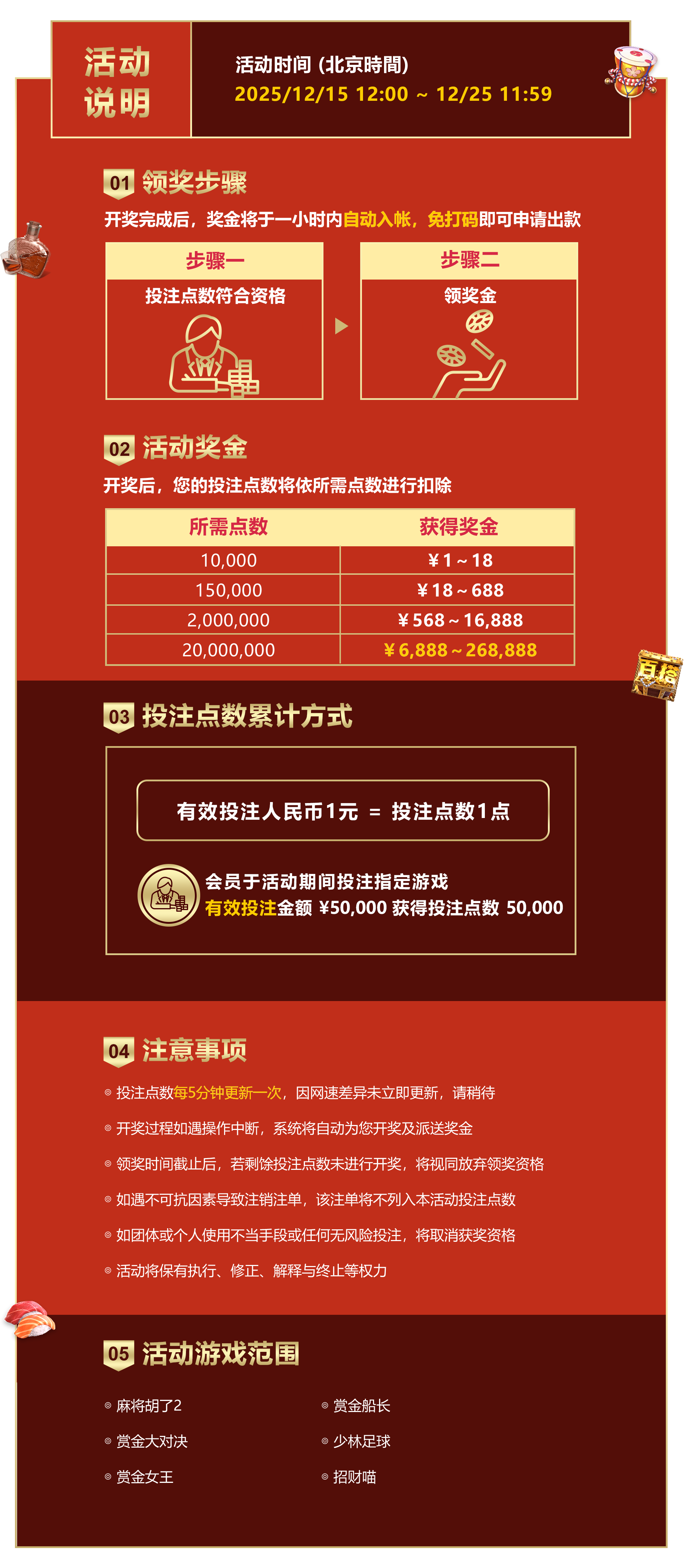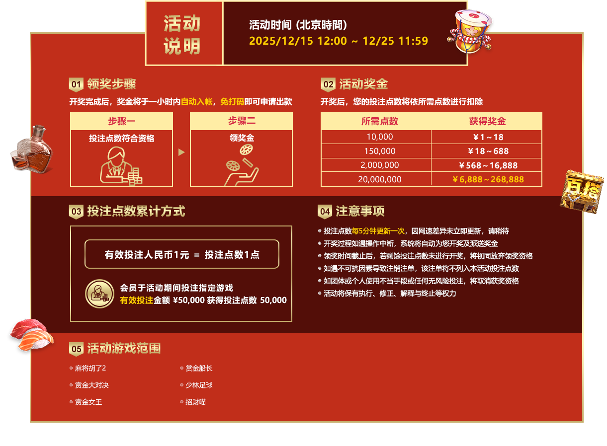 - 活动期间:2025/12/15 12:00 - 12/25 11:59 (北京时间),累积投注点数及领奖时间。