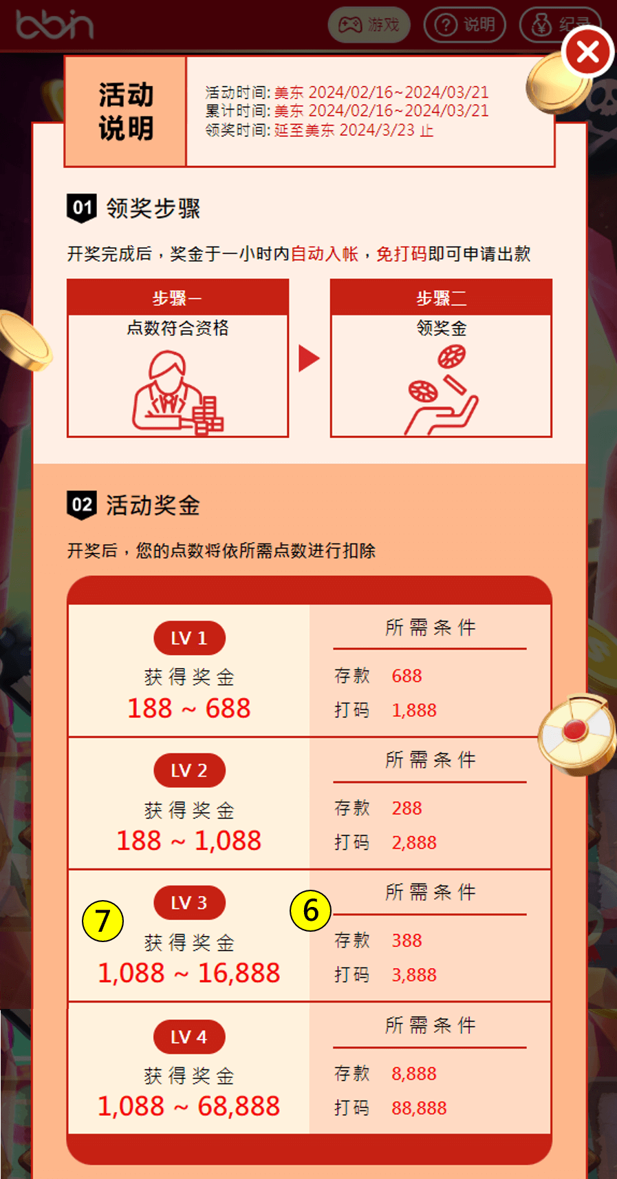 * 若门槛设定存款及打码,会员需同时符合才能进行领奖